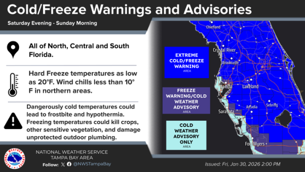 The odds of significant cold, coastal, and marine impacts across South Florida this weekend continues to increase. An Extreme Cold Watch is in effect for the Lake Okeechobee region and coastal Palm beach County and a Freeze Watch is in effect for inland Collier, Miami Dade and Broward counties. Wind chills could drop into the 20s across all of South Florida early Sunday morning. Very breezy conditions are expected on Saturday afternoon through early Sunday morning as the strong cold front pushes through the area. Sustained winds 15-25 mph could gust up to 40 mph, with highest winds likely along the immediate coastlines. A Gale Watch is in effect for local waters beginning on Saturday afternoon and evening. Sustained winds of 30-40 knots with higher gusts is possible across the Atlantic and Gulf waters through Sunday afternoon. Wave heights could peak as high as 12 feet across the Gulf and Atlantic waters during the day on Sunday as well.