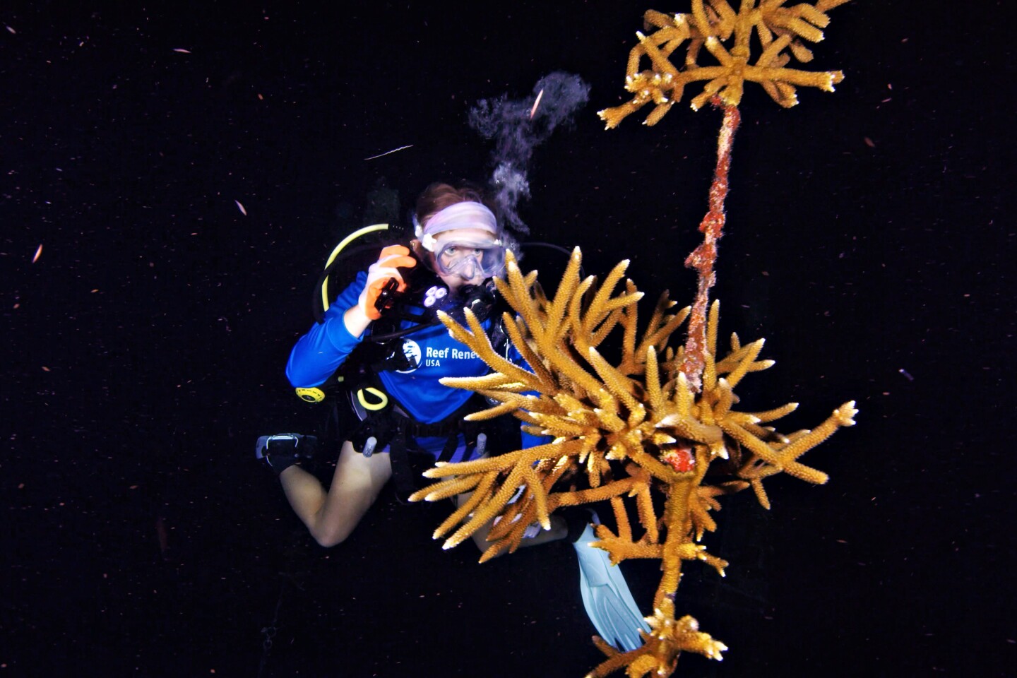 A net captures gametes (eggs and sperm) from a spawning staghorn coral at Reef Renewal USA's offshore nursery near Key Largo. Scientists collect the reproductive cells during the annual August spawning event to crossbreed corals and cryopreserve samples for future restoration efforts. The work helps boost genetic diversity and resilience on North America's only living barrier reef. FOR EDITORIAL USE ONLY (Frazier Nivens/Florida Keys News Bureau) (Frazier Nivens)