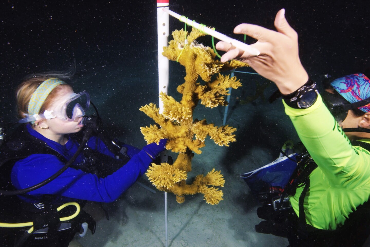 A diver from Reef Renewal USA examines a coral 'tree' in the nonprofit's offshore nursery near Key Largo, checking for signs of spawning. Each August, several days after the full moon, corals release millions of gametes (eggs and sperm) in a synchronized reproductive event. The spawn is vital for genetic diversity and offers a hopeful sign of resilience for North America's only living coral barrier reef. FOR EDITORIAL USE ONLY (Frazier Nivens/Florida Keys News Bureau) (Frazier Nivens)