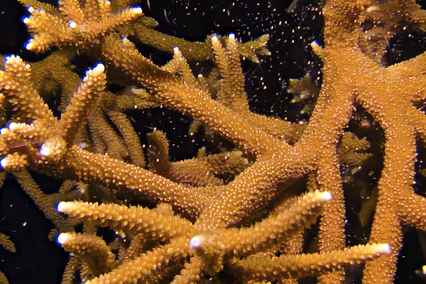 'Let's Get It Spawn': Coral reefs in the Florida Keys released millions of gametes (eggs and sperm) during a moonlit mass spawning event near Key Largo. The rare phenomenon creates a "snow globe effect" as reproductive cells drift through the water column. This annual event, which occurs only once a year in August, several days after the full moon, was captured at one of Reef Renewal USA's offshore coral nurseries, a vivid sign of coral health and resilience. FOR EDITORIAL USE ONLY (Frazier Nivens/Florida Keys News Bureau) (Frazier Nivens)