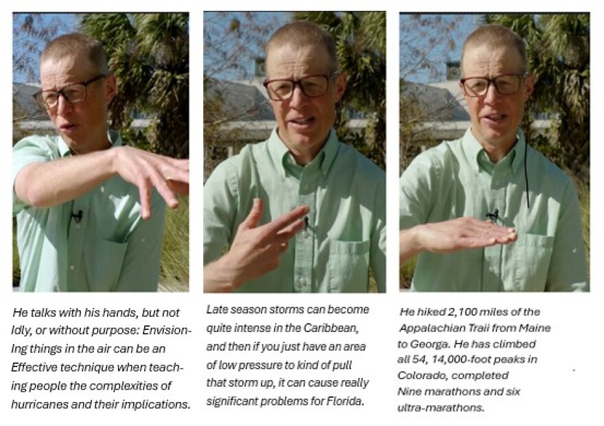 I first interviewed Klotzbach on a sunny but windy afternoon on the campus of Florida Gulf Coast University. He nearly shouts when he talks, and I’m still not sure if that is because he’s forever excited about what he does, or he knows projecting his voice is a good thing during an interview with TV cameras. But I’ve seen him lecture several times before I interviewed him, and he shout-talks then, too. He also talks with his hands, but not idly, or without purpose: Envisioning things in the air is a very effective technique when teaching people about the complexities of hurricanes and their implications.