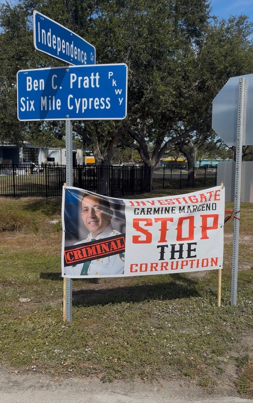 A small but determined crowd gathered on the corner outside the Lee County Sheriff’s Office on Six Mile Cypress Parkway for a “Stop the Corruption” rally. The timing was no coincidence - the demonstration came just days after officials announced they had closed a yearlong investigation into Sheriff Carmine Marceno.