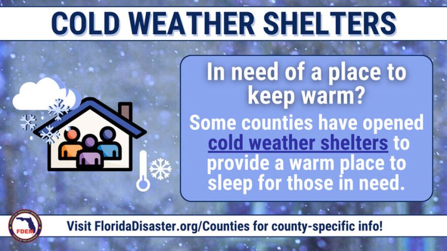 The Salvation Army will also open a cold weather shelter at its Manatee County location, 1204 14th St. W., Bradenton, with check-in beginning at 6 p.m. on Monday, Jan. 26, and Tuesday, Jan. 27.