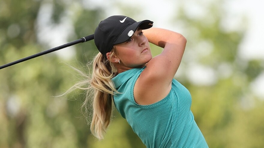 Gianna Clemente drives from the fifth tee during the second round of the LPGA Tour Kroger Queen City Championship golf tournament in Cincinnati, Friday, Sept. 9, 2022. (AP Photo/Aaron Doster)