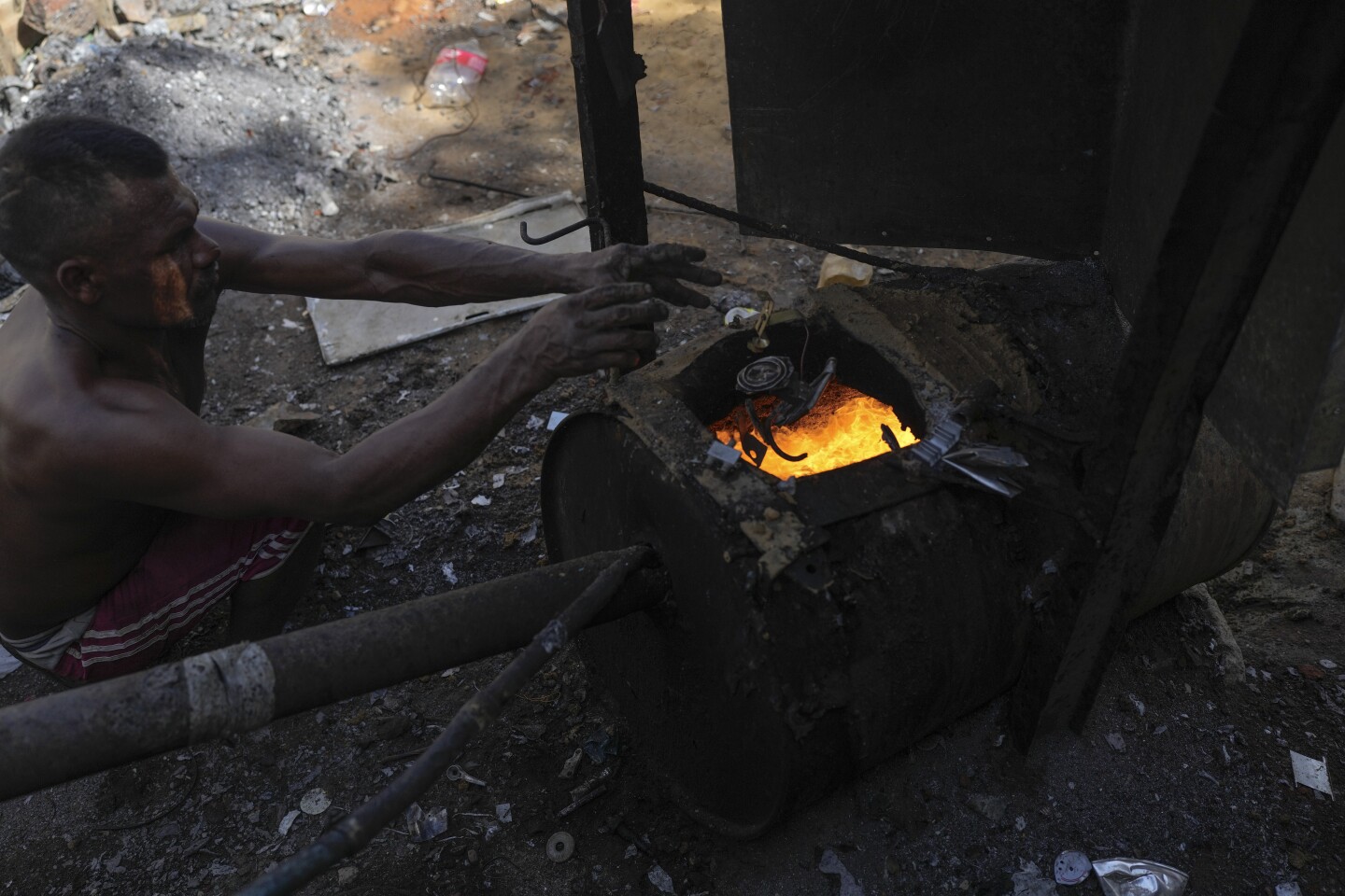 A worker hired by the Romero Perez family, who returned to Venezuela from Mexico after abandoning plans to reach the United States amid President Donald Trump's migration crackdown, melts aluminum to make pots in Maracaibo, Venezuela, Monday, June 16, 2025. (AP Photo/Matias Delacroix) (Matias Delacroix/AP / AP)