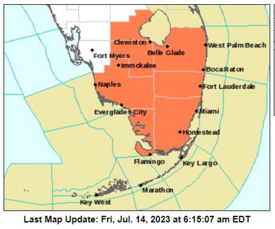 For today, the National Weather Service continued a daily heat advisory until 8 p.m. for parts of southeast, southern and southwest Florida –- coastal and inland Collier County, as well as Hendry and Glades counties and other points east. The advisory is also to be in effect until 8 p.m. on Saturday and Sunday.