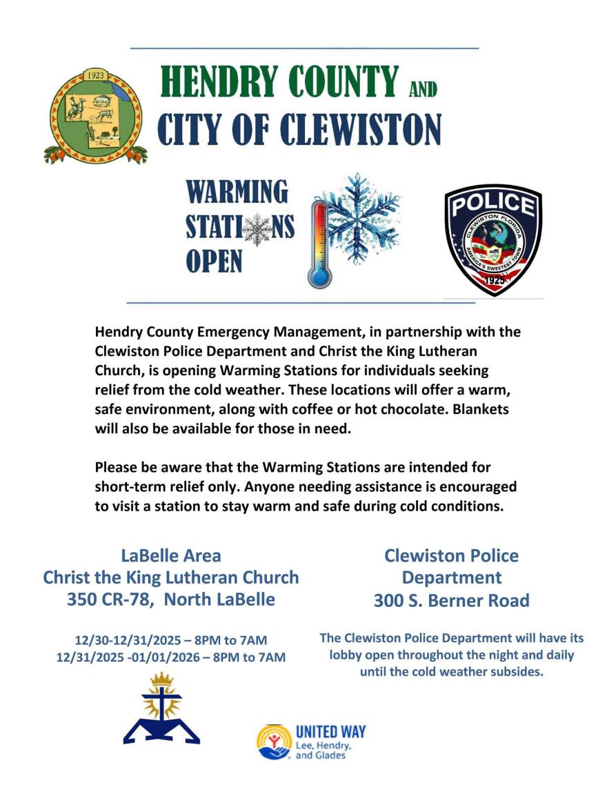 Hendry County Emergency Management, in partnership with the Clewiston Police Department and Christ the King Lutheran Church, is opening warming stations for individuals seeking relief from the cold weather.