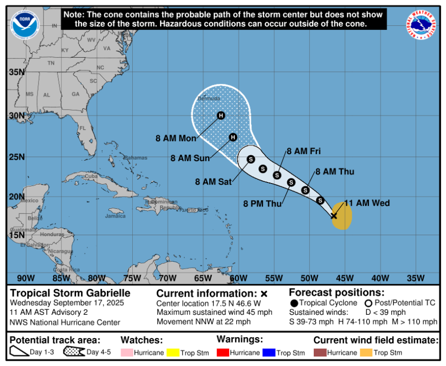 The National Hurricane Center has officially named the seventh storm of the season, Gabrielle. The tropical storm will stay over the central tropical Atlantic through the end of the week. It will also stay away from the U.S. East Coast.