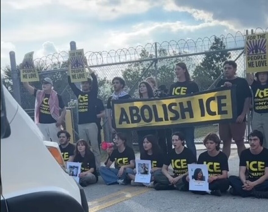 Photos from the action showed a group of young people wearing shirts saying "ICE Kidnapped my neighbor" sitting and blocking a portion of a road at the site.